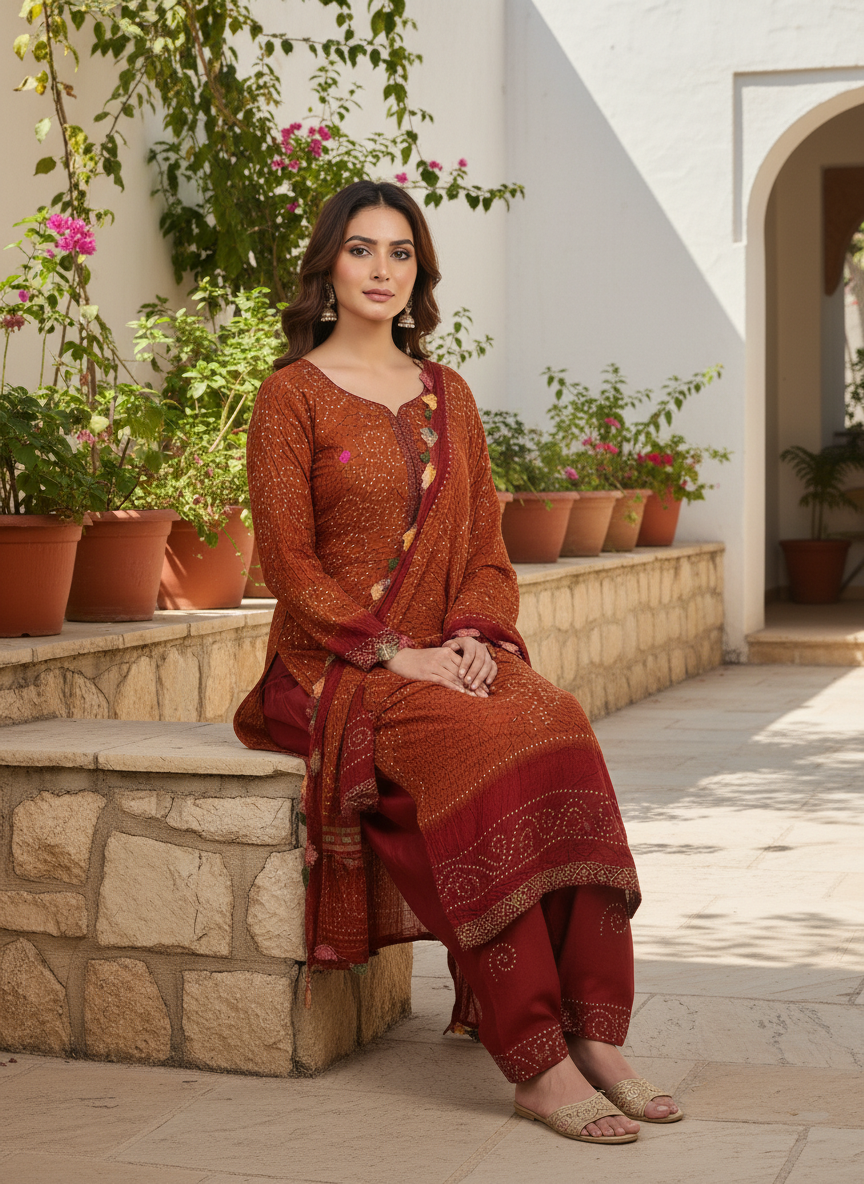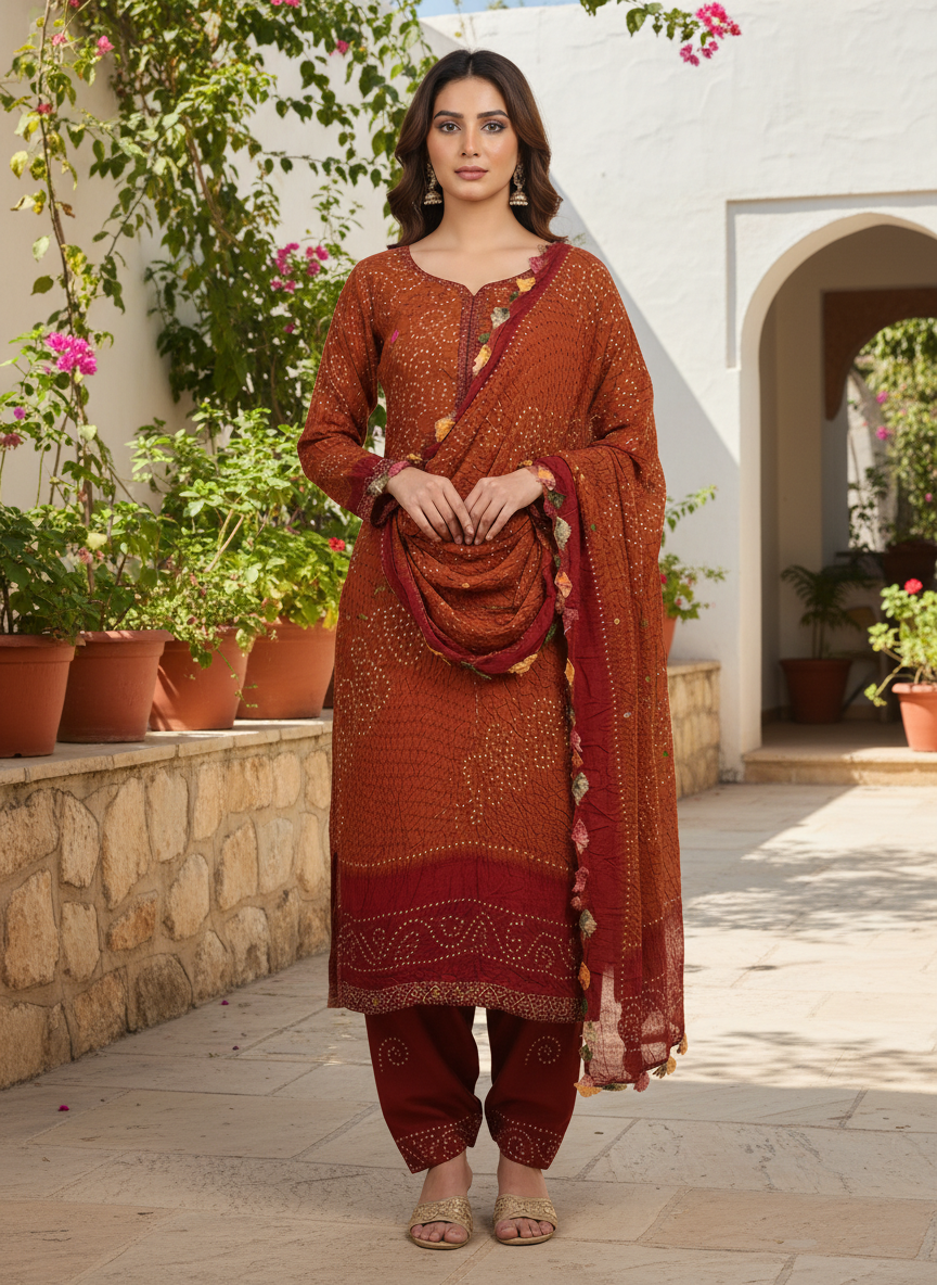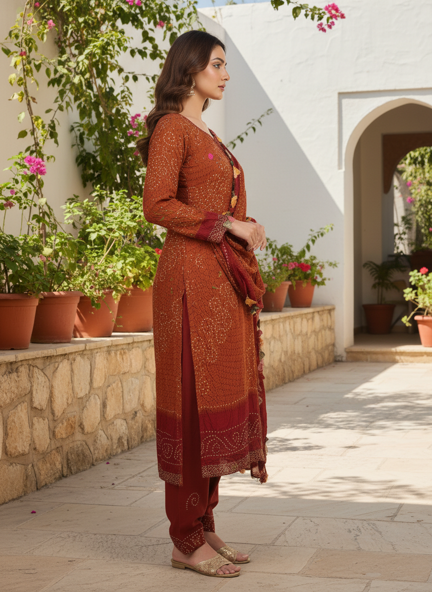 Exude elegance with this Exclusive Mustard & Red Linen 3PC Suit, designed for women who value sophistication and luxurious style. The warm mustard paired with vibrant red creates a striking yet graceful combination, perfect for festive and formal occasions.