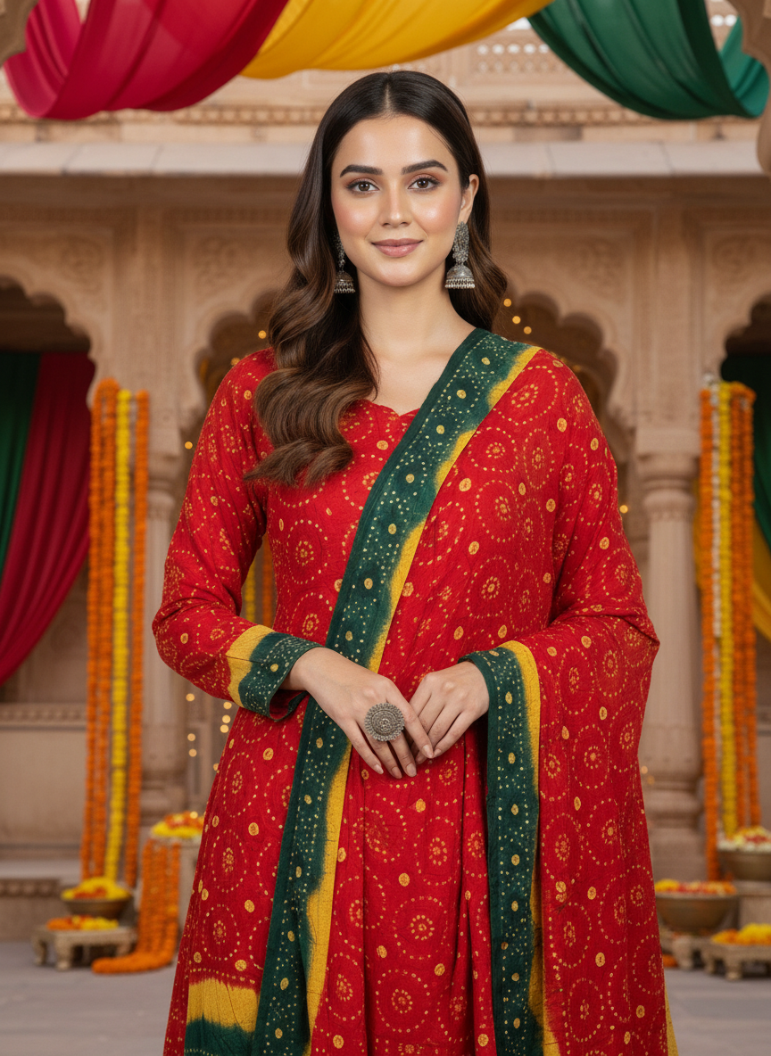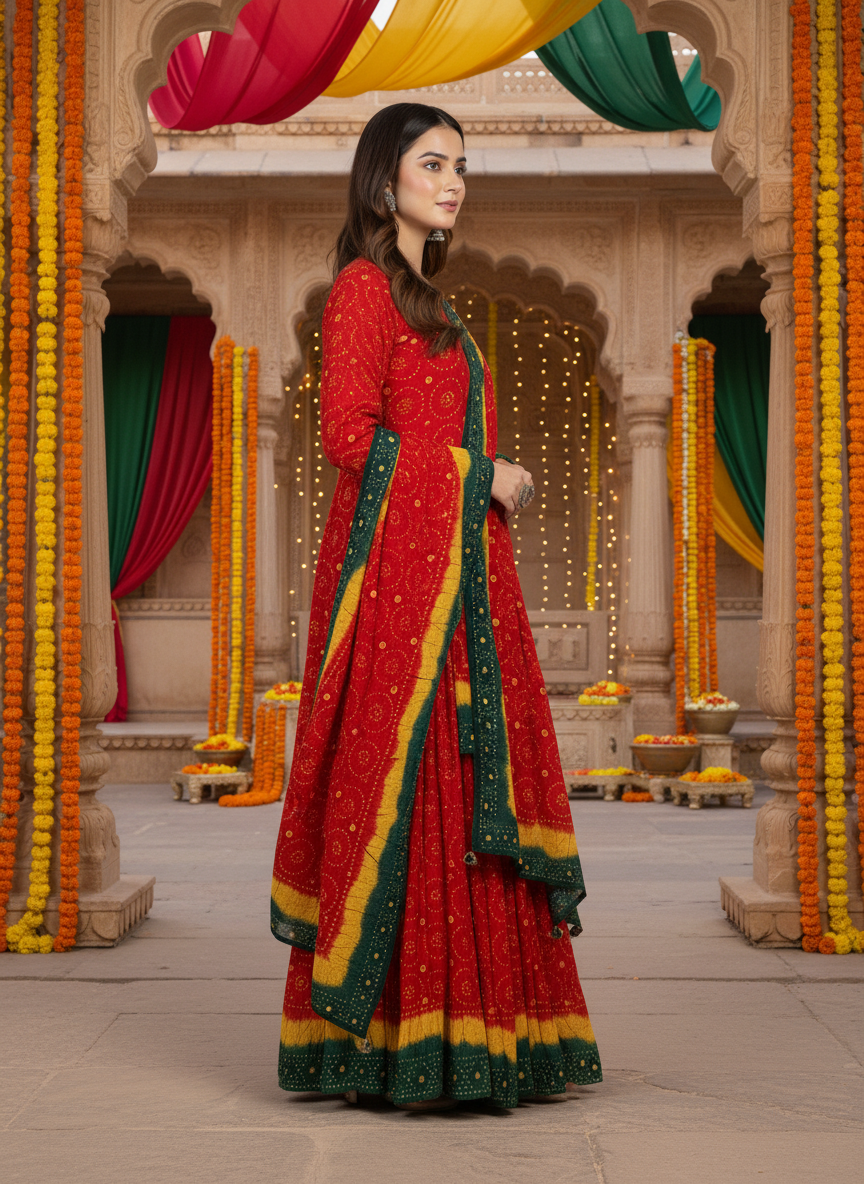Exclusive Red, Yellow & Green Chuniri Lehenga Set – Luxury Unstitched Ensemble for Women