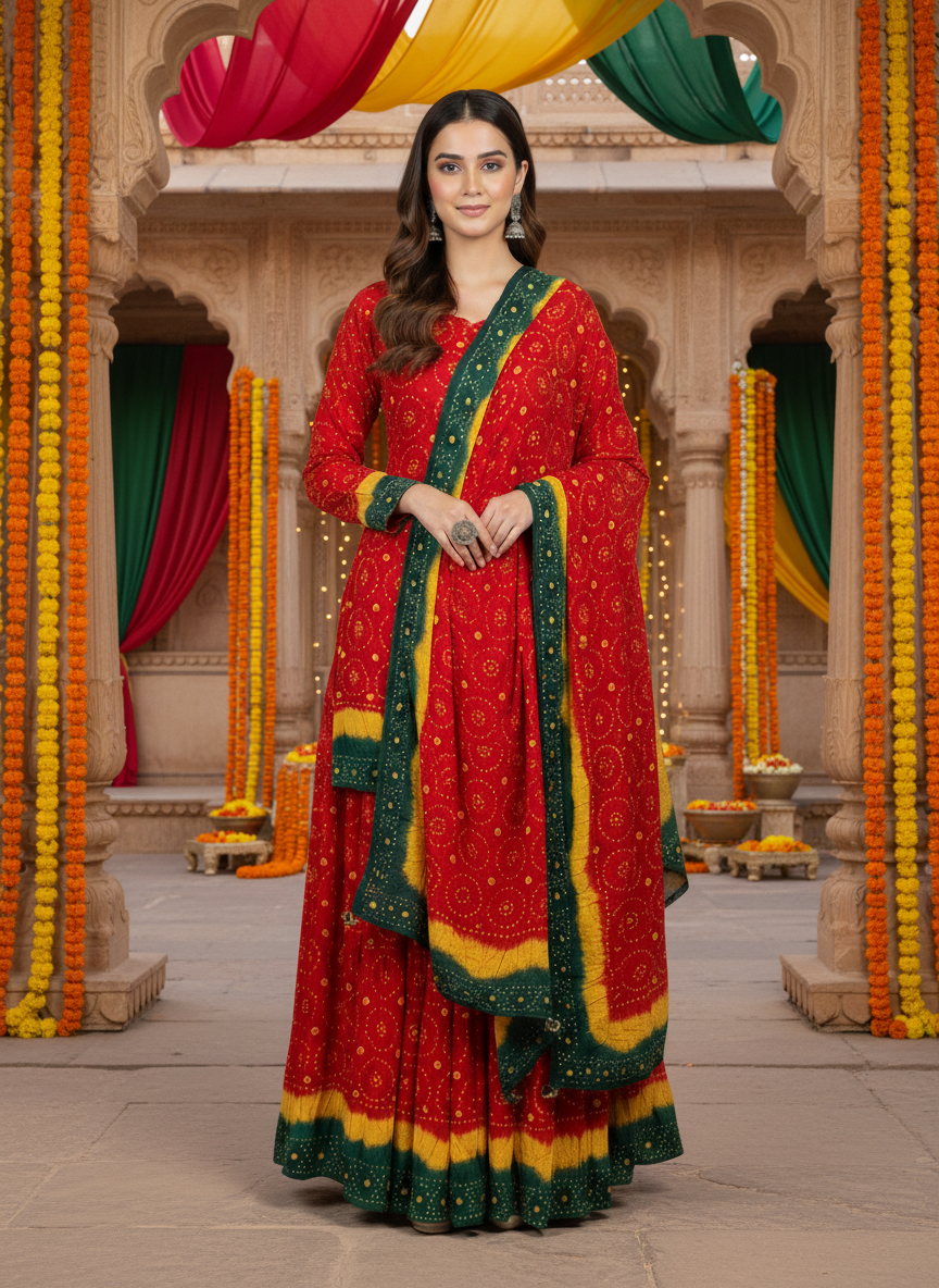 Exclusive Red, Yellow & Green Chuniri Lehenga Set with a vibrant and luxurious color combination. Unstitched for a custom fit. Perfect for weddings, festive, and formal occasions.