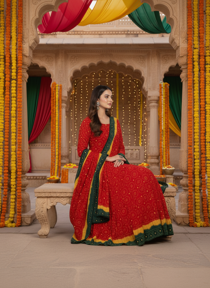 Celebrate vibrant elegance with this Exclusive Red, Yellow & Green Lehenga Set, designed for women who appreciate luxurious ethnic fashion. The bold red, radiant yellow, and refreshing green come together to create a striking festive palette, perfect for wedding functions and grand celebrations.