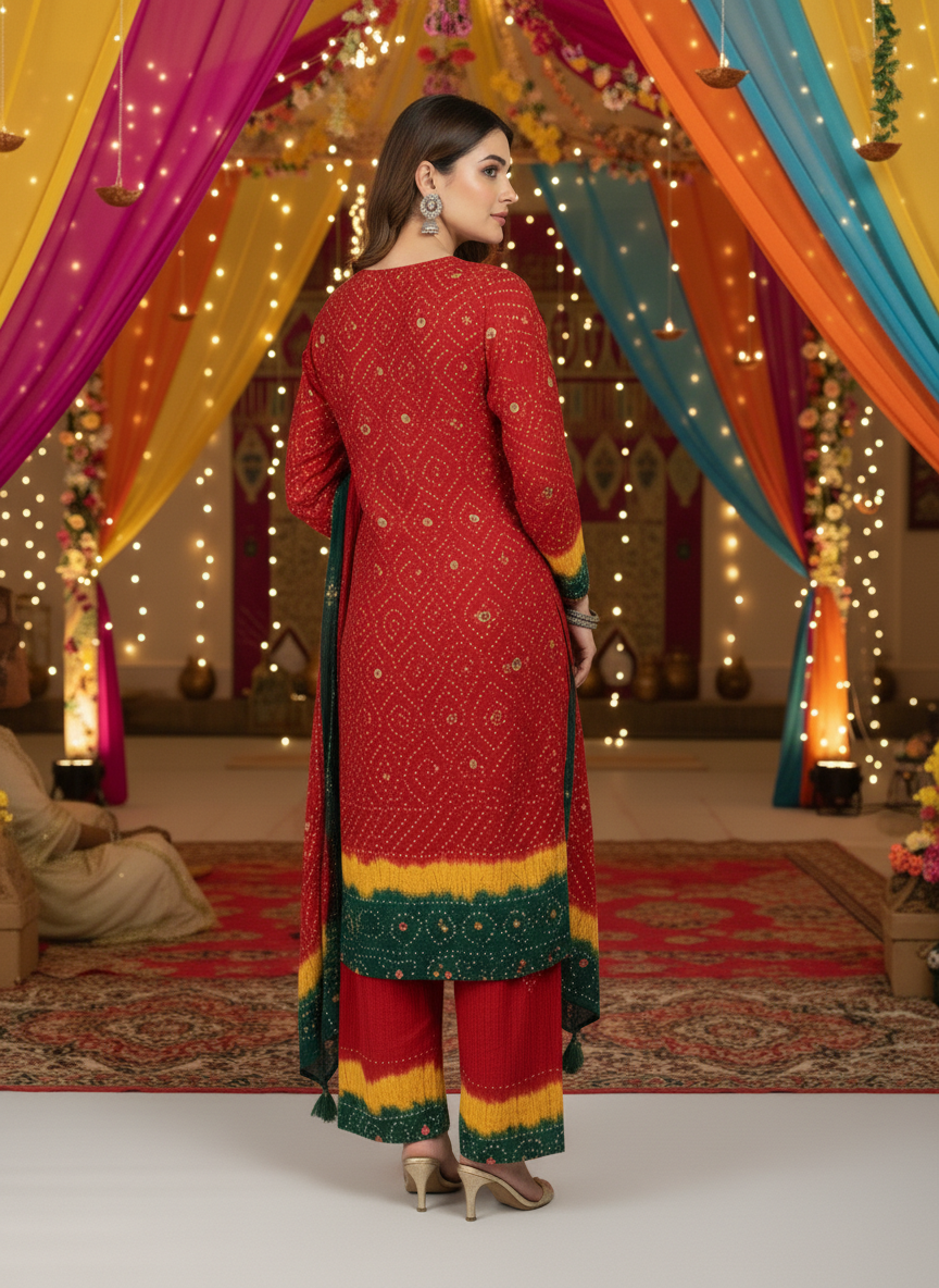 Exclusive Red, Yellow & Green Linen 3PC Suit with a vibrant and luxurious color combination. Unstitched for a tailored fit. Perfect for festive, formal, and semi-formal occasions.