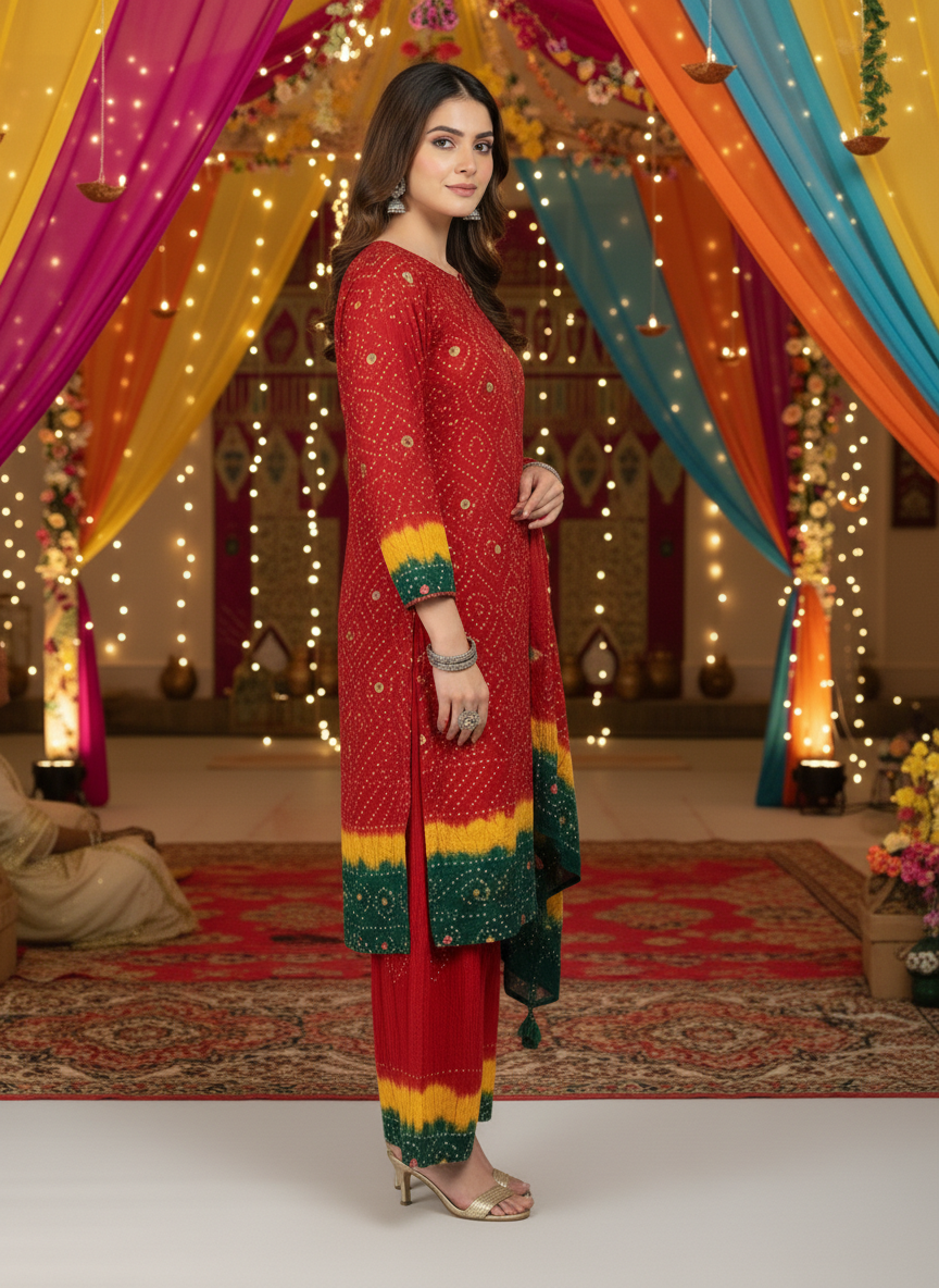 Exclusive Red, Yellow & Green Linen 3PC Suit – Luxury Unstitched Ensemble for Women