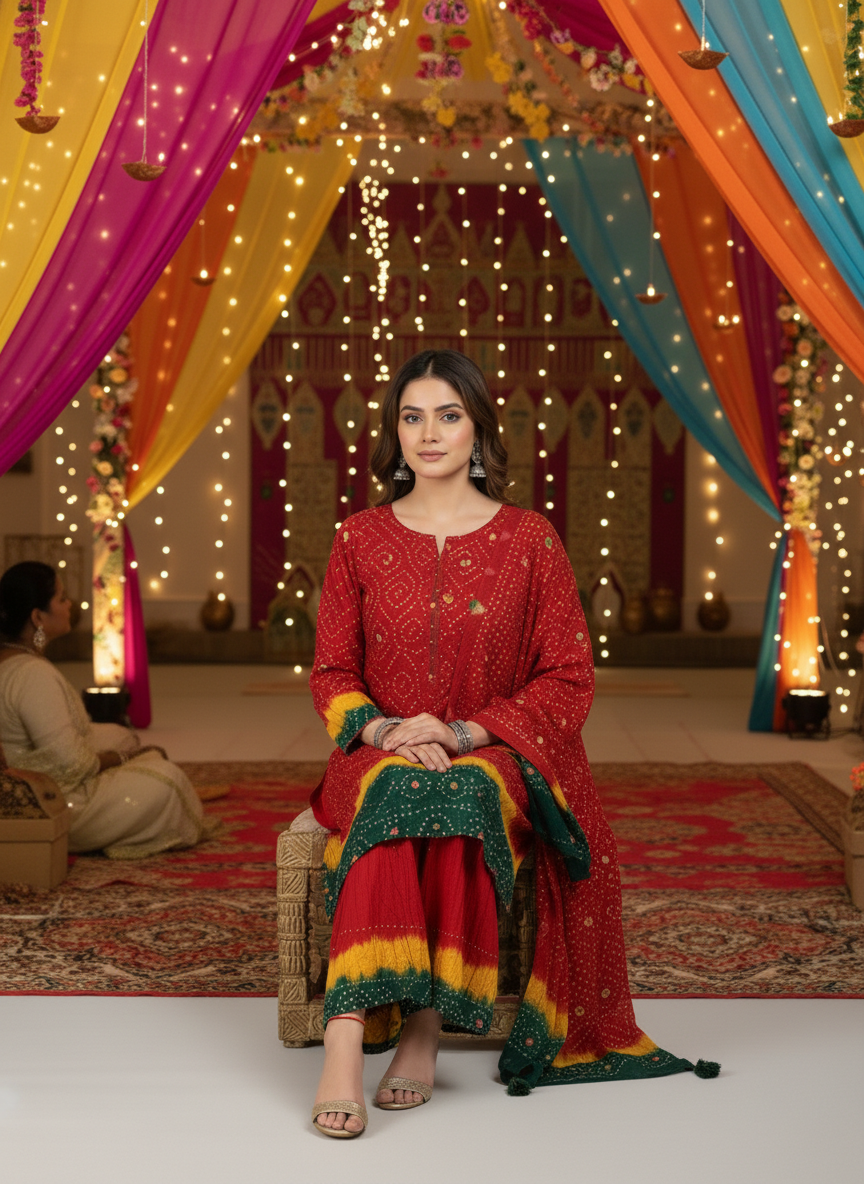 Add a vibrant touch of luxury with this Exclusive Red, Yellow & Green Linen 3PC Suit, designed for women who love bold, sophisticated fashion. The striking red, sunny yellow, and refreshing green form a lively and elegant color palette, perfect for festive gatherings, formal events, and semi-formal occasions.