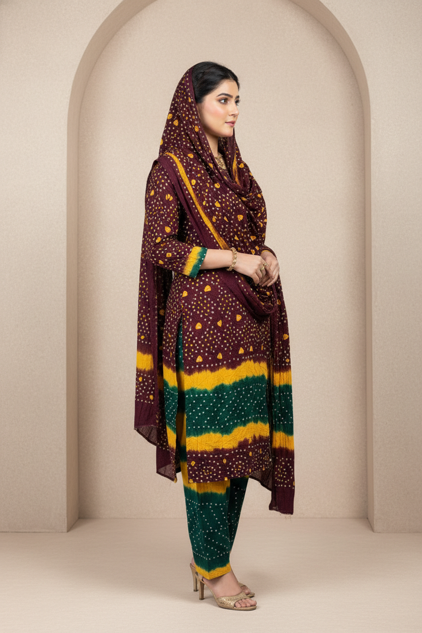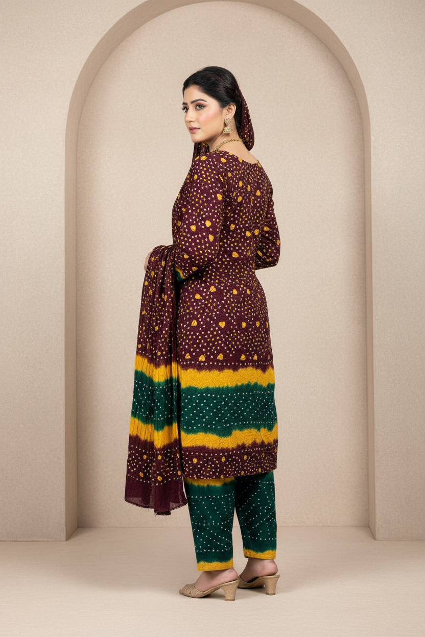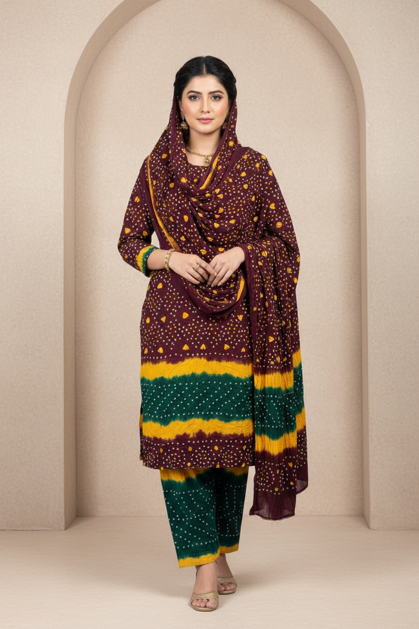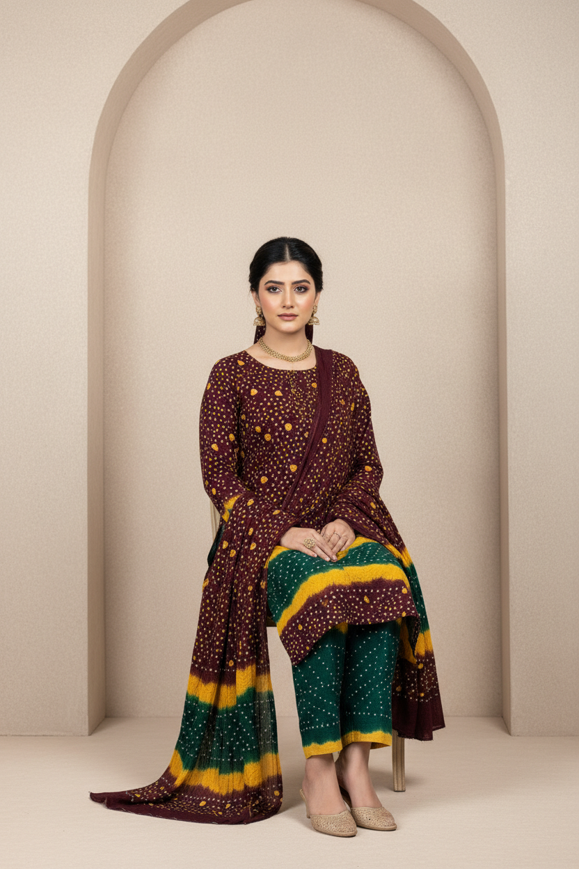Maroon Yellow Green Chiffon 3PC Suit – Unstitched Premium Outfit