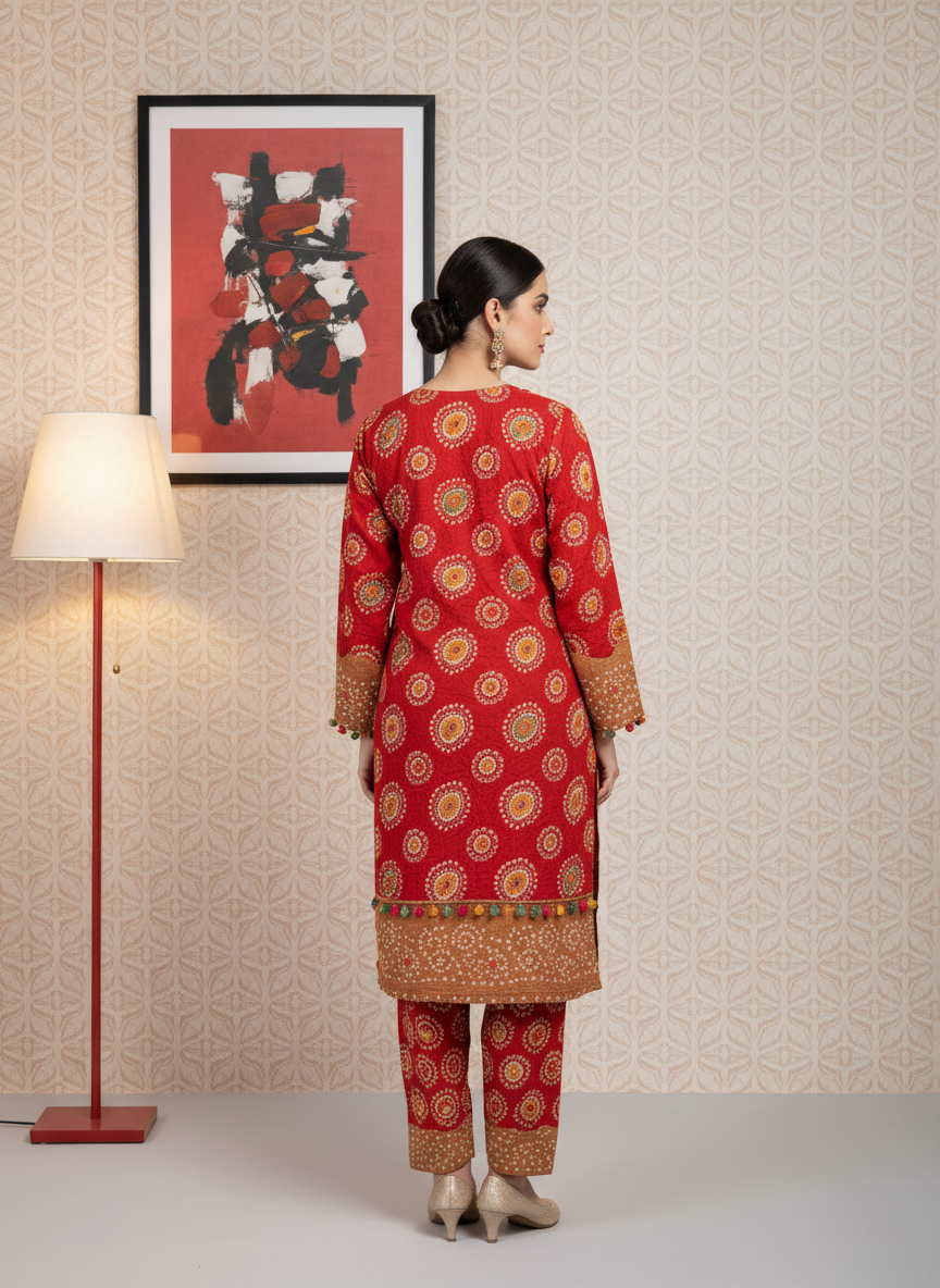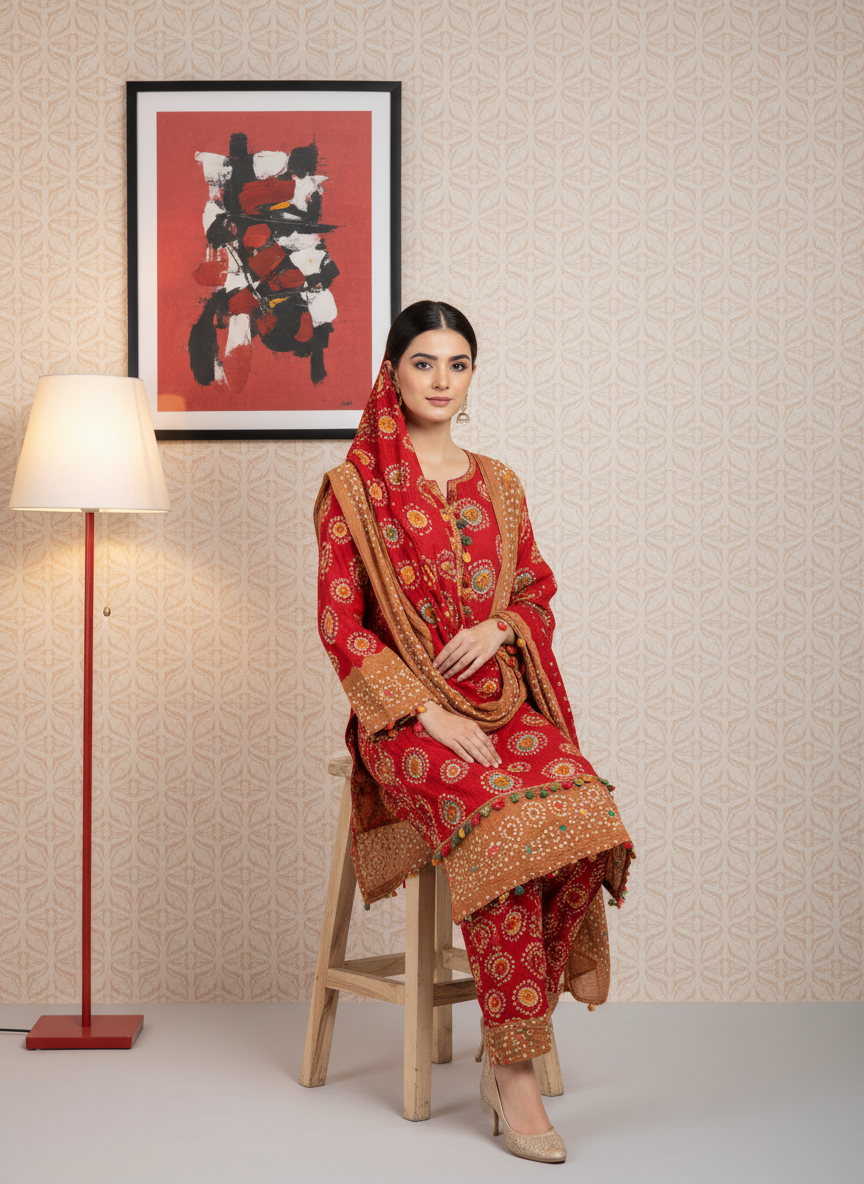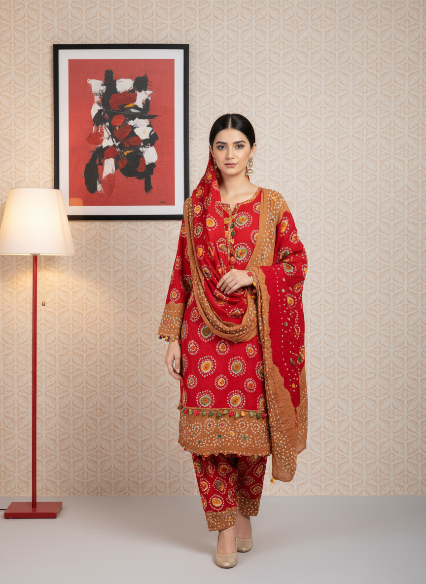 Red & Skin Linen 3PC Suit – Elegant Unstitched Dress