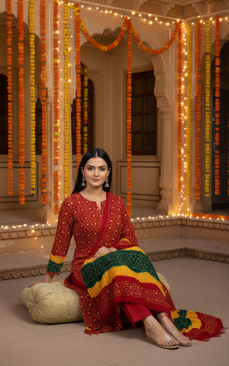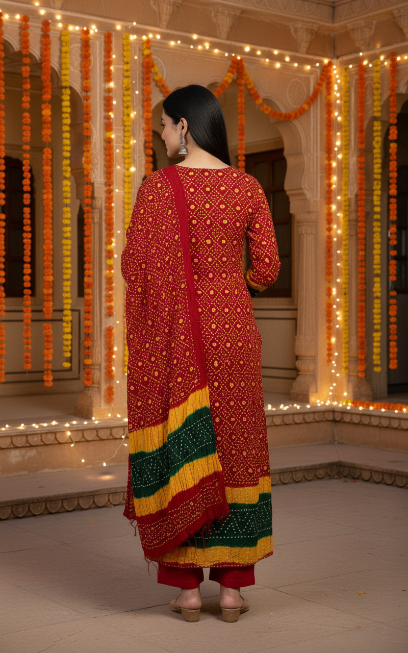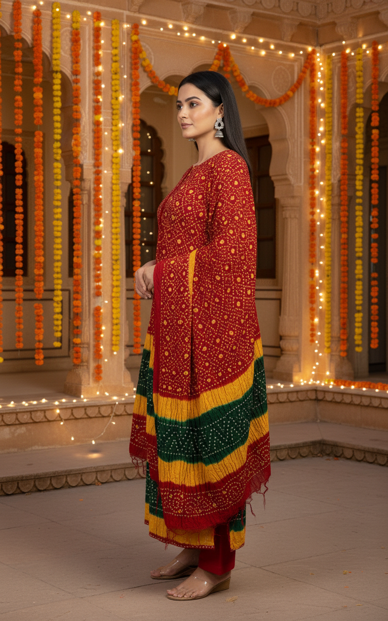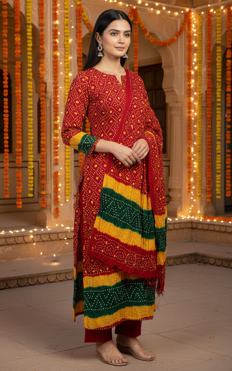 Celebrate vibrant style with this stunning Red Yellow Green Chiffon 3PC Suit, designed for women who love bold and lively color combinations. The richness of red, the brightness of yellow, and the freshness of green come together to create a festive and eye-catching outfit.